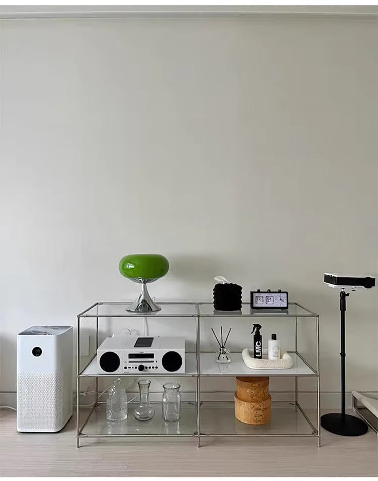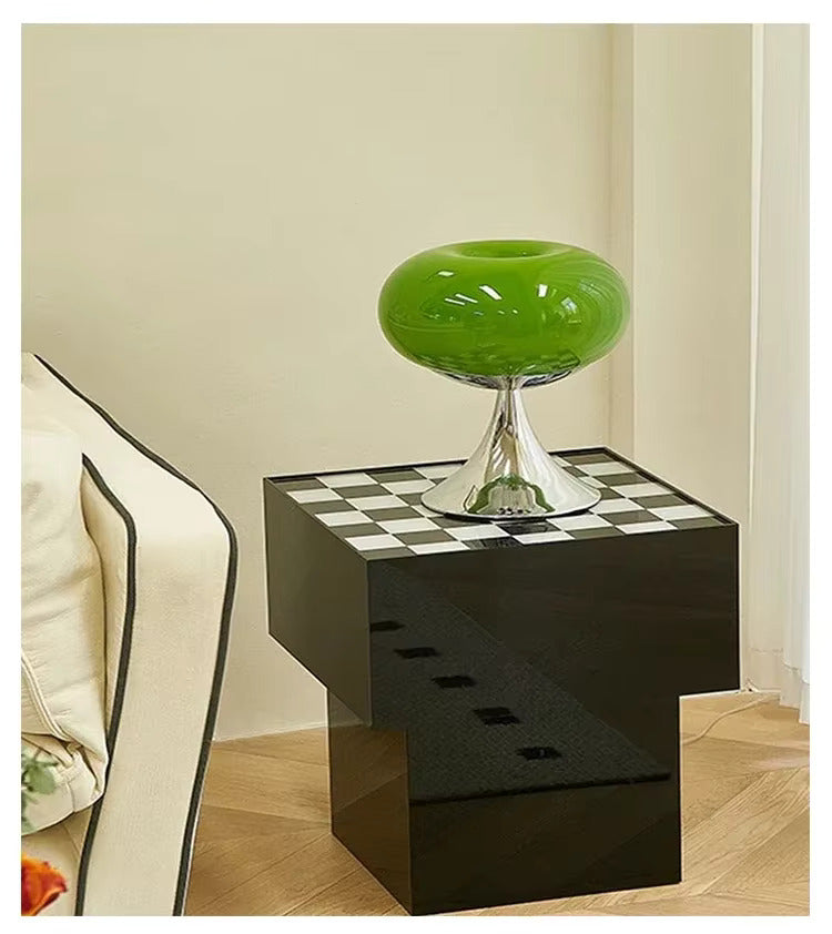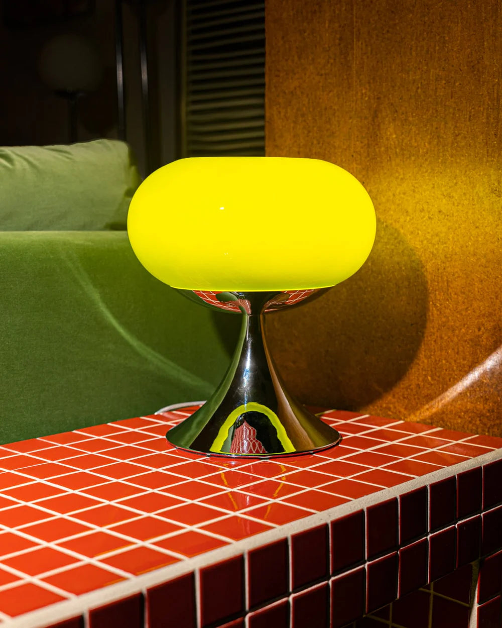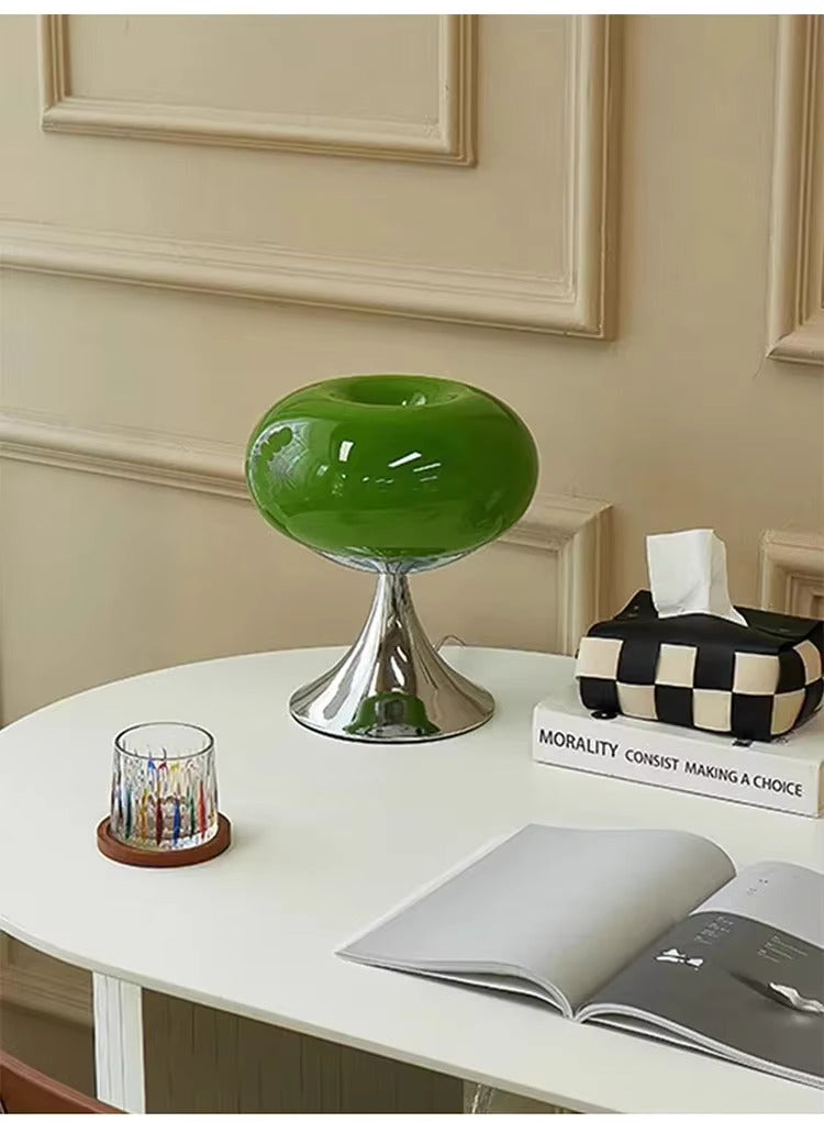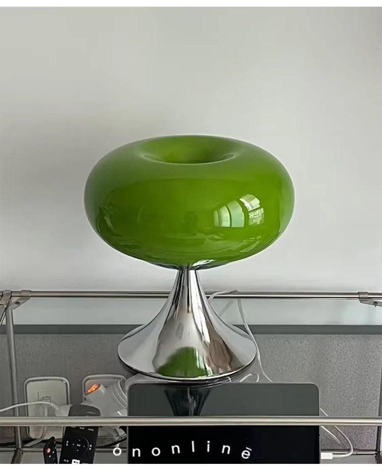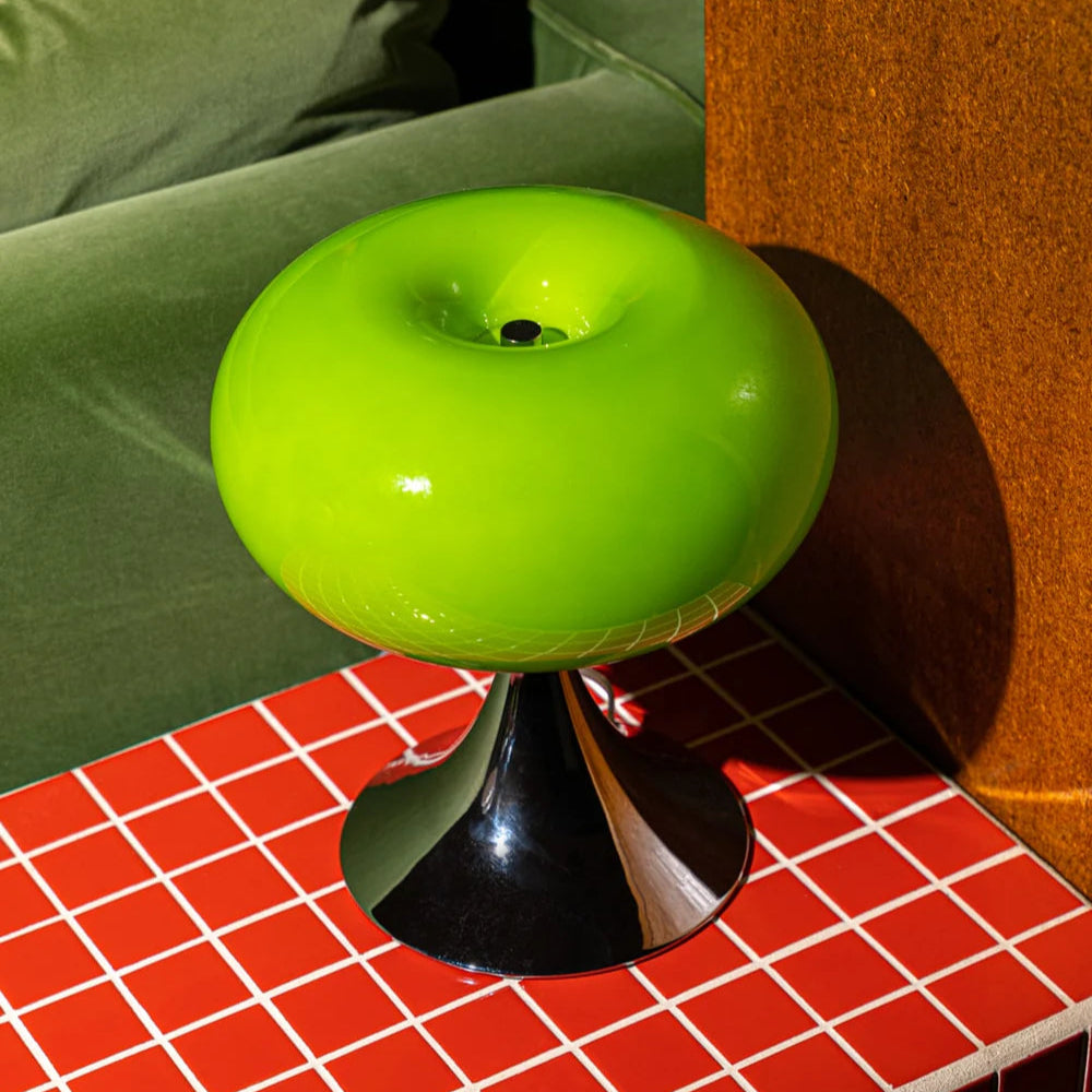 Con una pantalla de vidrio en vibrante color verde y una base cromada en forma de tulipán, la Lámpara Space Age se convierte en un verdadero punto focal en cualquier habitación. Su diseño icónico y atemporal es ideal para complementar estilos eclécticos, minimalistas o mid-century modern.